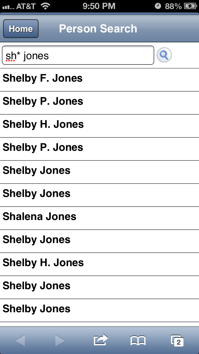 The Name Search menu is used to find any client record in the database, regardless of their Role. In the example shown here, all names of "Jones" and beginning with "Sh" are found. In addition to Defendants, the list includes Defendant Aliases, Court and Non-Court people.